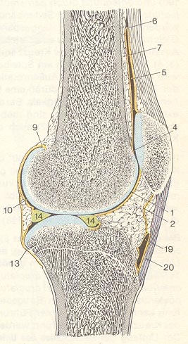 und polsternde Menisken (14) und straffe, seitliche Bänder. Das umliegende Gewebe weist