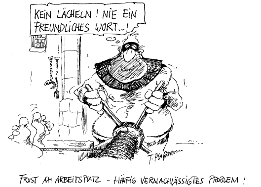 Nein, Zahnärzte sind keine grausamen Folterknechte: Sie bemühen sich um einen nicht unwesentlichen Teil unserer Gesundheit. Ich weiß das auch durchaus zu schätzen. Trotzdem habe ich Jörg zum Ende der Behandlung die Karikatur "Frust am Arbeitsplatz" geschenkt. Die will er nun in seiner Praxis aufhängen: Ein Schelm, der Böses dabei denkt... ;-) |