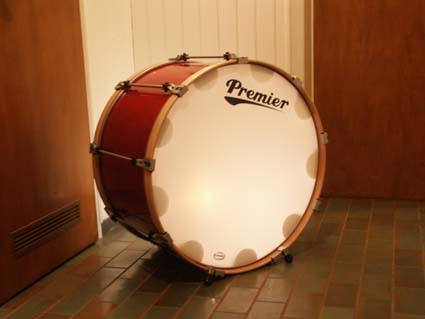 Schützenfest in Iserlohn, ich vertrete den verhinderten B/D der 1st. Sauerland PD. Am Vorabend hatte ich in Monikas Augen gelesen, dass ich lieber mit der Sauerland Bass als mit meiner spielen soll: Das Band Logo... ;-) Aber der Sound dieser Bass ist "suboptimal", also mache ich sie auf und werfe einen Blick hinein: Ein Filzstreifen hängt traurig über den Trommelrand und baumelt mittig unter dem Fell! Zudem liegt eine Schaumstoffmatte lose im Kessel und bedeckt ca. 50% der Innenfläche. Ich habe einiges gesehen, aber diese Variante ist mir neu. Was tun? Filz für Patches ist nicht da, wohl aber doppelseitiges Klebeband. Also eine Ringdämpfung: Die Matte wird in vier gleiche Streifen geschnitten und die Streifen dann mit etwas Überstand an den Kesselrand geklebt. Klappe zu, Affe tot, und nach dem Stimmen ist der Sound OK.